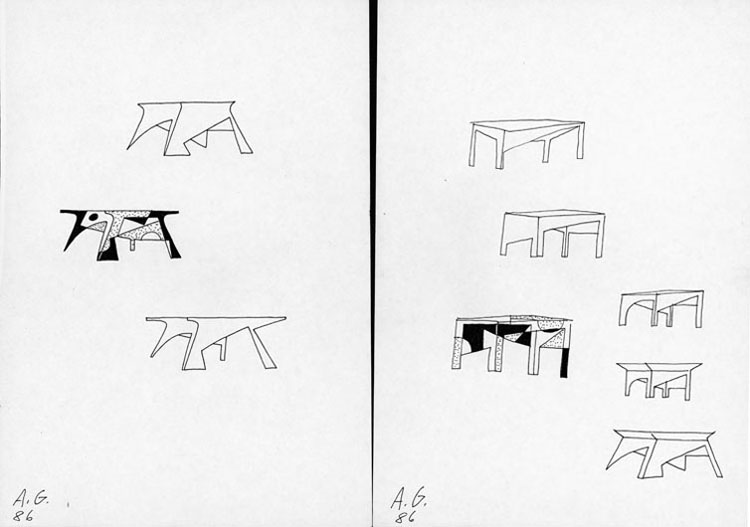 Ma vorrei spostare le considerazioni su un aspetto preciso di questo Bisogno di disegnare. Come transfuga (quasi) dall’architettura costruita, amo tutti i “sogni di architettura”. C’è bisogno, oggi, di oggetti lontani, molto lontani e anche perfetti. Mentre la vita (e le idee) si muovono troppo vorticose, certi designer-poeti disegnano e disegnano, per antidoto alla crudeltà del realizzare e del costruire. Si tratta di Disegni/Design, di un paradosso completo e definito “in sé”. Sono “cose” immaginarie, oggetti mentali collocati su luoghi ideali, dentro a spazi-tempo che sprofondano nei cieli della nostalgia metafisica. Cose, spesso, inadatte alla presenza delle persone, simboli complessi, concettuali e risucchiati fuori dalla vita, che vorrebbero la presenza di un uomo perfetto, che da quei disegni è assente, che “non c’è”. Fece così Sant’Elia, fanno così oggi alcuni Maestri della Tendenza e del post-moderno che è inutile citare, è così per Alchimia, che compone centinaia di schizzi e designi, con linee appuntite e molli, aste, puntini, textures, bandiere al vento, piani e volumi, toni acri o delicati, un inesausto variare di figurazioni evocative della sua utopica città, la “città Alchimia”.